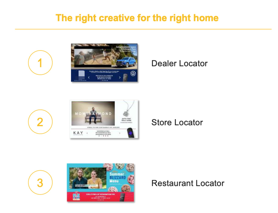 早在2006年,Comcast就尝试基于不同家庭电视用户的地理位置进行广告投放;等到了现在这个流媒体主导的时代,平台有了更多可用来定位的要素和标签来让广告在大屏上更“千人千面”,比如观看某部电视剧的同一集,养宠物的用户可能会看到宠物饲养用品的广告,而孕妇可能会看到母婴用品。在Hulu上投放定位广告的一家汽车经销商集团的数字营销分析师提到,通过按位置来做定位投放,就可以确保看到广告的人离经销商门店足够近,方便去线下了解和下单。