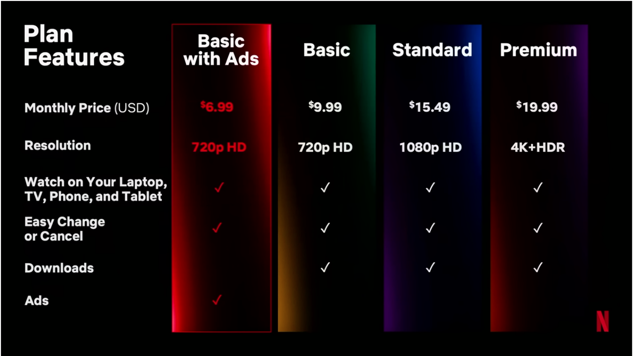 其他广告业务更为成熟的流媒体平台,虽然没有过于保守,但因为其基础模式都是需要用户付费的订阅制,再加上市场竞争极为激烈,这就使平台必须得考虑到用户的认知门槛和使用体验。所以整体上,各平台对于含广告、不含广告的套餐,在订阅价格、可获得权益和有哪些限制等方面都划分得较为简单和清晰。