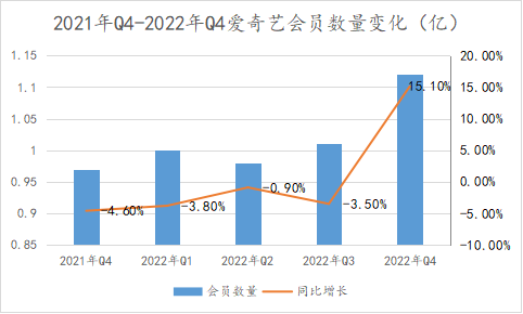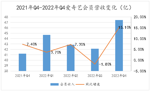 在首次实现年度盈利背后,爱奇艺的经营表现正在全面好转。2022年四季度,在广告业务表现不佳的情况下,爱奇艺会员营收实现47亿,同比增长15%。与过去几个季度相比,四季度爱奇艺的会员营收增速明显提升。