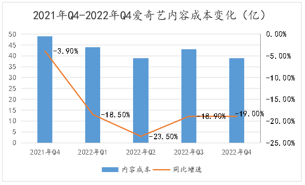 值得一提的是,爱奇艺收入的加速增长,还是在内容成本大幅下降的基础上实现的。2022年Q4,爱奇艺内容成本为39亿,同比下降19%。这是爱奇艺连续5个季度实现内容成本下降。其中,自2022年Q1开始,爱奇艺内容成本至少同比下降18%。