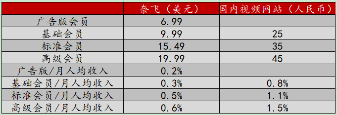 目前,国内视频网站基础会员、标准会员、高级会员/人均收入占比为0.8%、1.1%、1.5。对比奈飞,奈飞基础会员、标准会员、高级会员/月人均收入分别为0.3%、0.5%、0.6%。