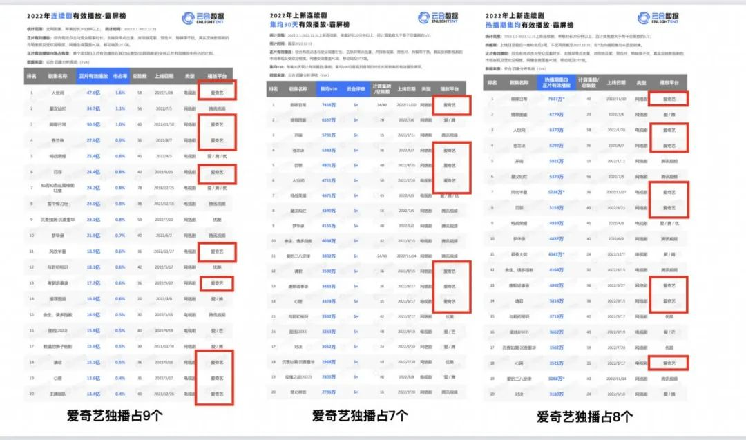从质量上看,爱奇艺的表现同样优于其他竞对。根据云合数据发布的2022年连续剧网播表现,在全网连续剧有效播放TOP20、热播期集均有效播放TOP20三项主要榜单中,爱奇艺均有12部以上作品上榜。如果仅算独播剧的话,爱奇艺分别有9个、7个、8个,均为行业最好表现。