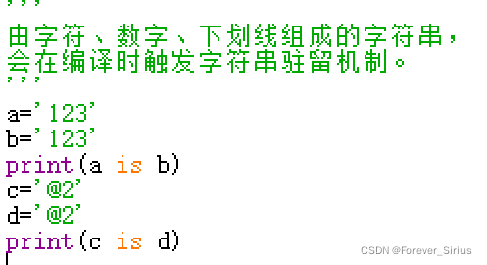 字符串驻留机制也是出于类似原因,只要变量内容相同便视为实质相同,不再有存储地址的区分。能触发驻留机制的字符串有一定规定,这规定基本类似于合法变量名的规定,至于长度的规定在不同的编译环境中有所不同,这个视情况而定。