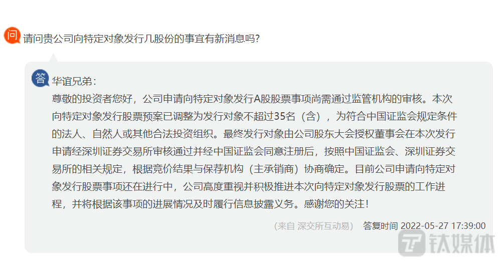 曾有多位投资者在互动平台询问定增事宜最新进展,得到的回复是:向特定对象发行股票事项还在进行中,尚需通过监管机构的审核。