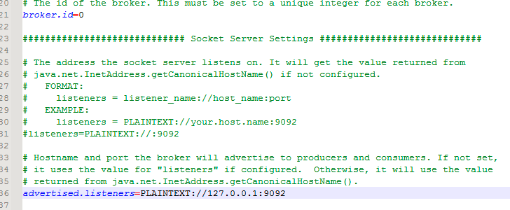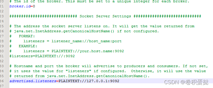 1.取消 **advertised.listeners** 注释,修改kafka地址与端口。如果要集群部署,broker.id不能重复,1号机是0,2号机是1这样的。