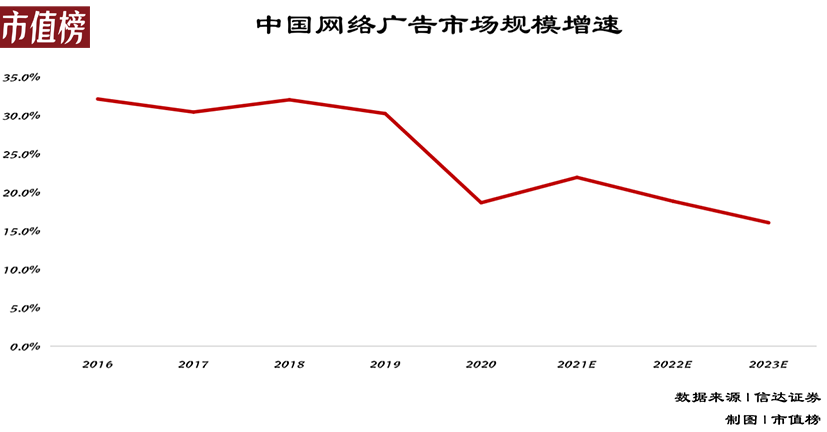 如上图所示,2020年以后,中国网络广告的市场规模增速呈现出明显下滑趋势,从前几年30%的高速增长,切换到低速增长模式。