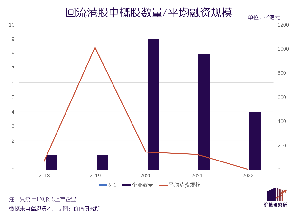 瑞恩资本统计的数据则显示,随着时间推移,年底返港上市的中概股募资金额越来越少,整个2022年返港上市的中概股平均募资金额仅为4.66亿港元,还不及2021年的零头。这也表明企业更重视上市速度而非融资规模,回流意愿相当强烈。
