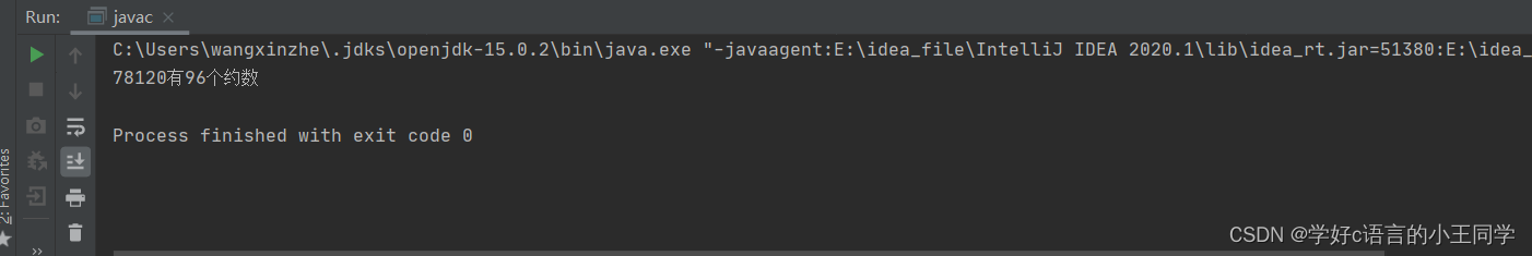 public class Main { // 对于一个整数,能整除这个整数的数称为这个数的约数。 // 例如:1, 2, 3, 6 都是 6 的约数。 // 请问 78120 有多少个约数 public static void main(String[] args) { int yueshu=0; for(int i=1;i<=78120;i++){ if(78120%i==0){ yueshu++; } } System.out.println("78120有"+yueshu+"个约数"); } }