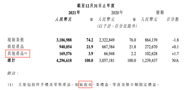 待到奈雪做了瓶装饮料一年多后,后者的存在感才强了一些,但谈不上地位有多高。从奈雪的2021年中期报、年报中,可窥见一二。瓶装饮料依然属于“伴手礼及零售产品”大类,但出现在了“其他”的备注中。
