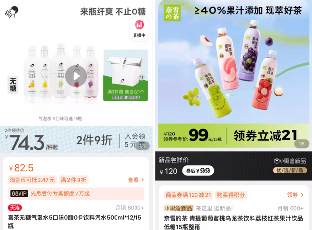 喜茶(左)VS奈雪(右)网店中,各自销量最高的瓶装饮料对比图源 / 天猫旗舰店