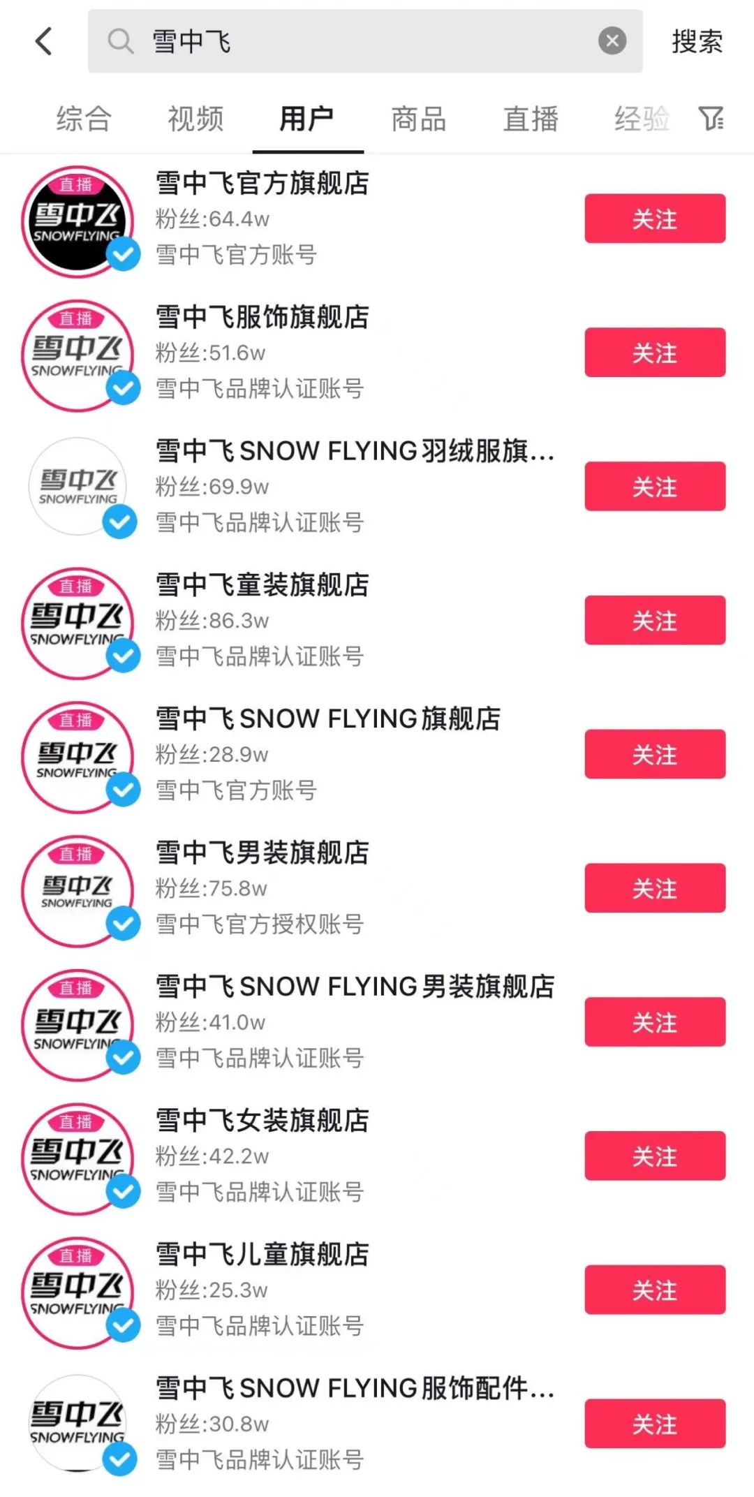 以近期在抖音热卖的另一国产羽绒服品牌雪中飞为例,在抖音输入“雪中飞”,会发现除了官方账号外还有数十个品牌认证账号,在抖音发布视频和开设直播间,形成矩阵式售卖。