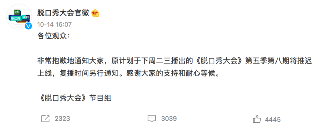 脱口秀爱好者们依然在等待它的后续节目。毕竟,“它已是脱口秀领域的顶级节目了,批评是希望能做得更好。”有观众这样表示。而10月26日,同样停播了一周的《一年一度喜剧大赛2》在官方微博发布海报称,将于今日播出。