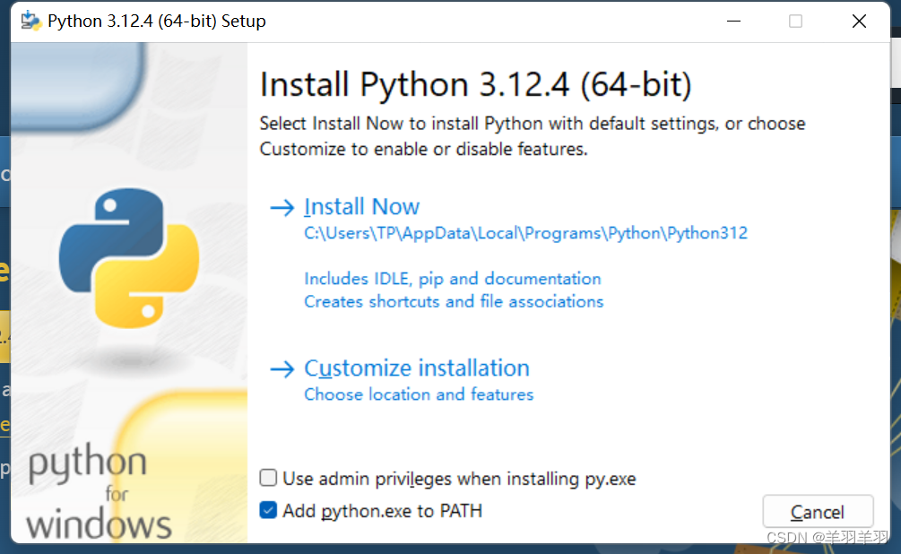 可以选择 Install Python 3.12 for all users,并且可以在下方自己更换安装路径后Install