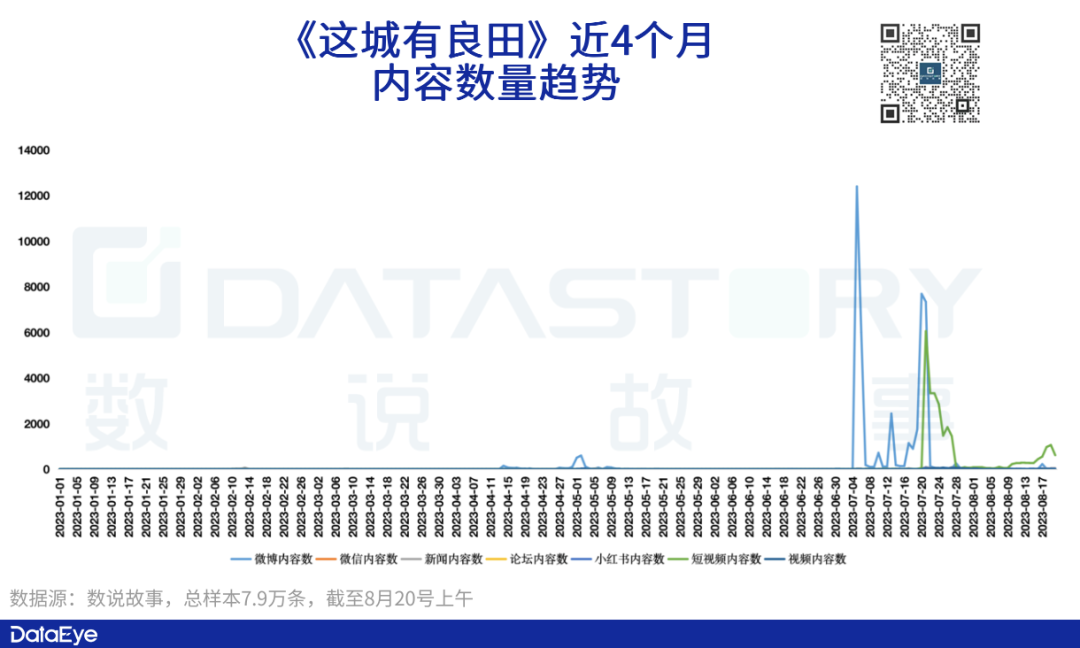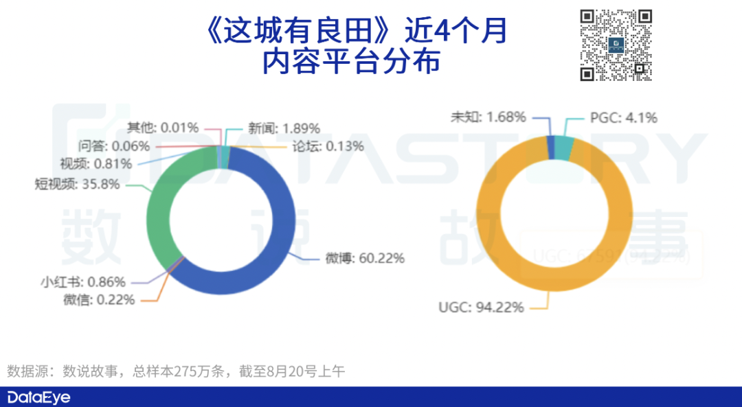 平台方面,内容数以微博为主要战场,占内容条数的60%,其次是短视频,占比在35%左右。具体在传播上,《这城有良田》在微博与短视频有着不同的策略。