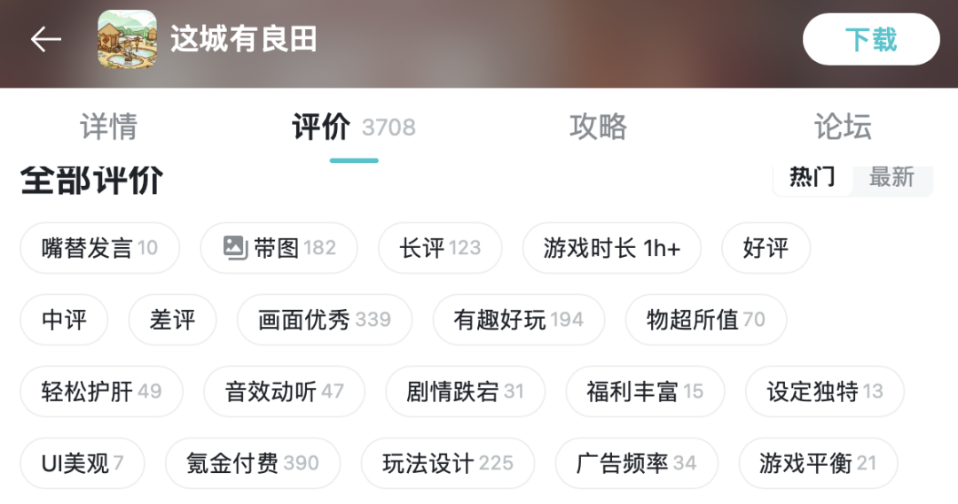 1、在产品打磨方面,从TapTap玩家评论看,玩家对于《这城有良田》游戏画面、玩法趣味性都报以一定的认可。该游戏不止于种地、收菜、买田置业,还融合了“官+商”两大领域,加入了RPG元素——模拟一位县令的治城之法。在收菜、卖货之外,游戏给玩家设计出了一条做官的主线。