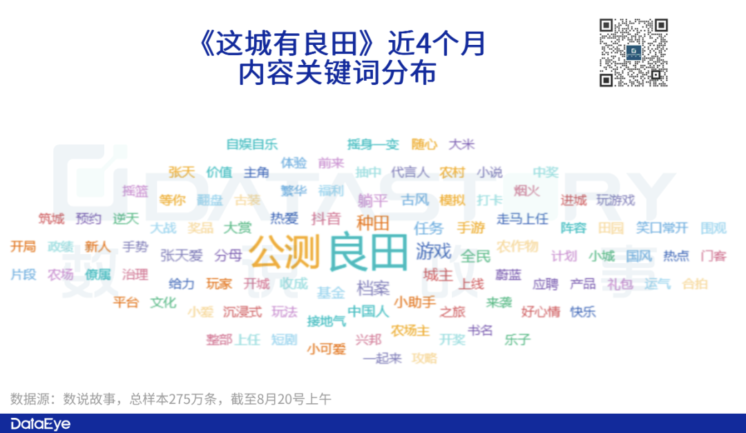 全网内容高频词方面,除了游戏名外,种田、代言人张天爱、城主、抖音、档案、任务、热爱等都是高频词。