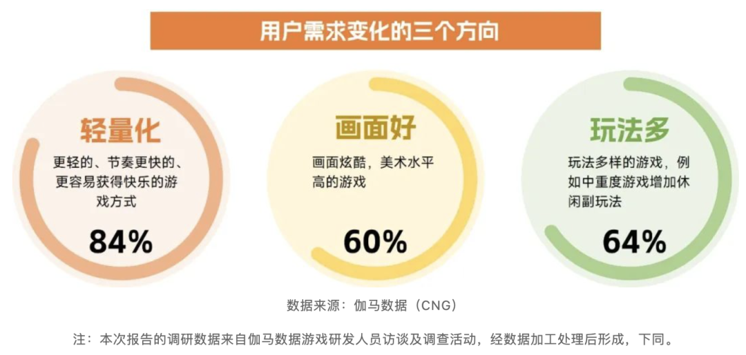 伽马数据发布的《2022-2023中国游戏企业研发竞争力报告》显示:国内游戏用户的需求发生新变化。具体包括:轻量化—— 偏好更轻的、节奏更快的、更容易获得快乐的游戏方式;玩法多——玩多样的游戏,例如中重度游戏增加休闲副玩法;画面好——画面炫酷,美术水平高的游戏。