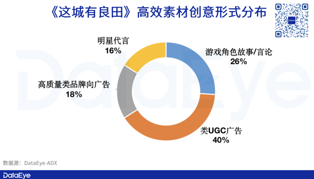《这城有良田》近90天高效素材TOP50素材内容中,四大类素材总体均衡。“类UGC广告”占比为40%,其次是游戏角色故事/言论(26%),以及质量品牌向广告(18%)。
