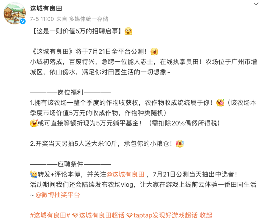 在微博平台,游戏会更多的用幽默、代入感类话术,进行游戏福利内容的推送,比如7月5日的微博内容,用“急聘”、“农场位置”(益世界总部)、“岗位福利”等文案。