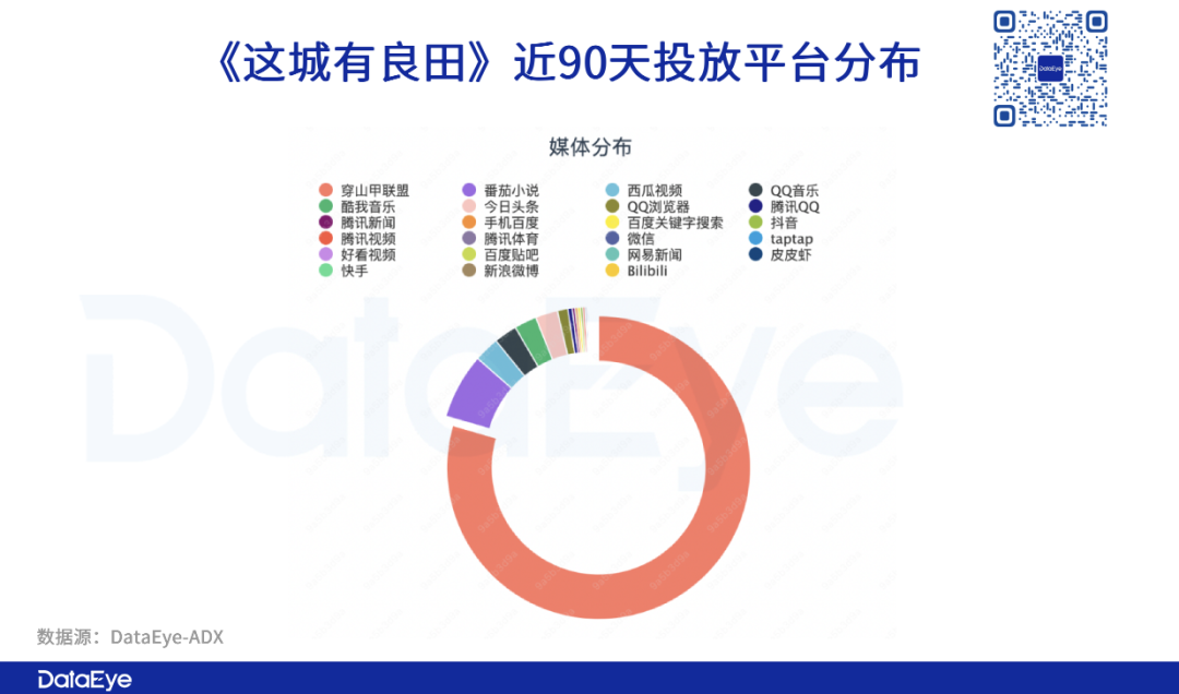 DataEye-ADX数据显示,《这城有良田》近30天主要投放渠道是穿山甲联盟,占比接近80%。其次则是阅读类平台番茄小说,占比约6.98%。