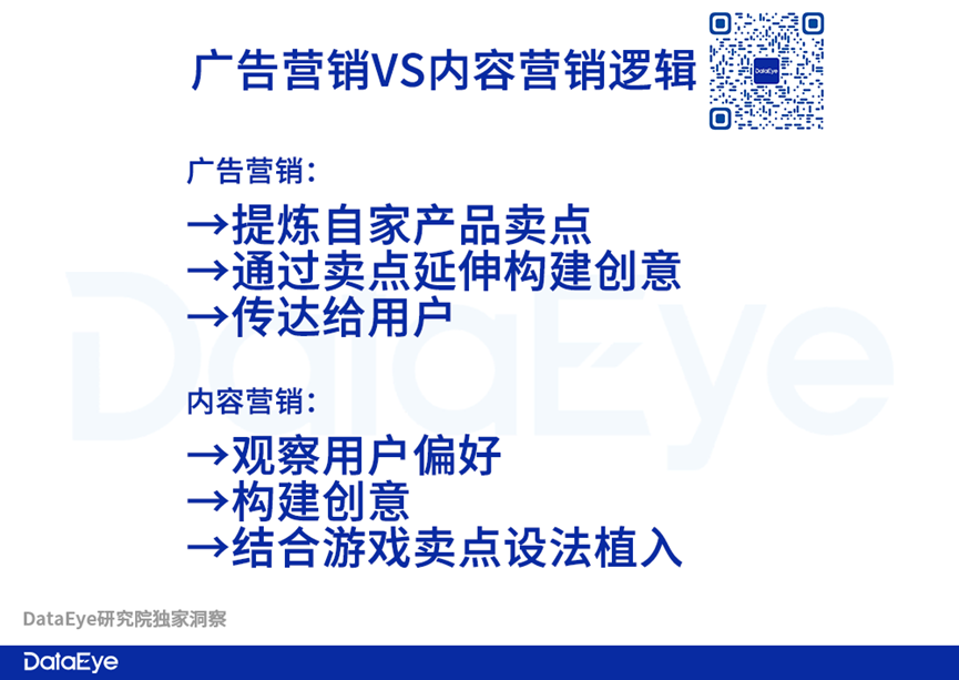 内容营销思维,确实正在确立:观察用户偏好→构建创意→结合游戏卖点,设法将游戏植入。