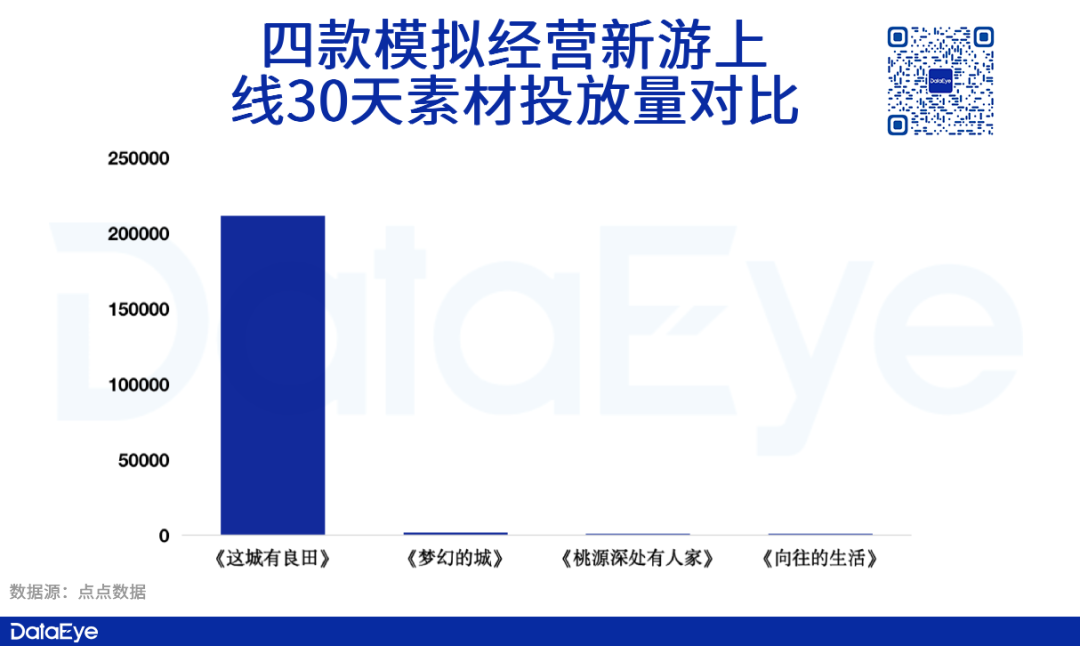 从总素材量来看,《这城有良田》近一个月投放素材超21万,对比近期上线的模拟经营产品,表现强势。