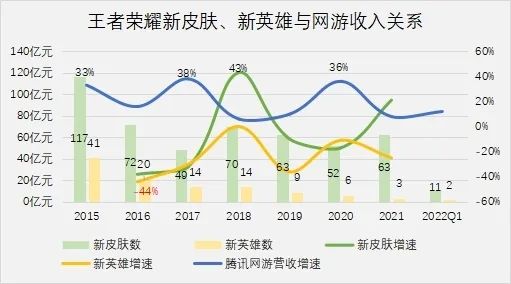 《王者荣耀》自从2015年上线到今年一季度,总计推出109位新英雄,497款各类皮肤。新英雄增长趋缓,表明游戏玩法创新力不复往日。而新皮肤上线节奏趋于稳定,可是对营收的拉动越来越不明显。