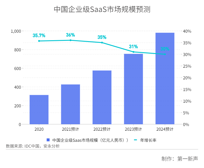 结合IDC公布的数据,安永预计到2024年,中国SaaS市场发展仍然处于起飞阶段,年增速不低于30%,但增速渐缓,市场将逐渐趋于成熟。