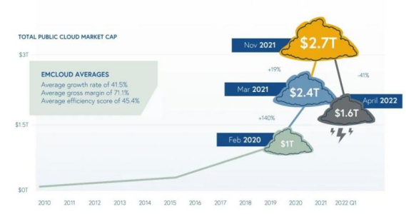 公开数据显示,2022 年刚开始,市场就遭遇急风骤雨的大回调,Bessemer 纳斯达克云指数(EMCLOUD Index)回落至 2020 年疫情前的水平,2022 年 5 月,EMCLOUD Index 所覆盖公司的总市值降到 1.4 万亿美元,平均估值倍数由 2021 年最高的 16x P/S 下降至 6x P/S,甚至低于 2020 年疫情前的水平。