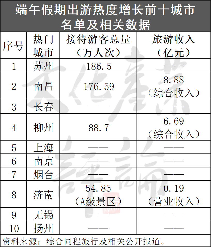 与此同时,同程旅行发布《2022端午假期旅行消费报告》还显示,在端午假期国内出游热度增长最快的10座城市中,苏州成为端午小长假旅游热度增长最快的城市,南昌、长春、柳州、上海、南京、烟台、济南、无锡、扬州等重点旅游城市也登上榜单。** **