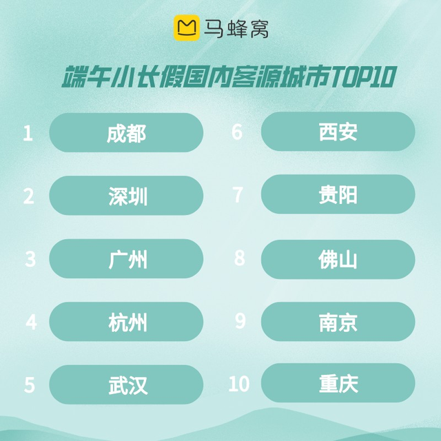 另据马蜂窝旅行玩乐大数据显示,在国内主要客源城市中,成都依旧领跑全国,位居榜首。端午前后“成都端午”的搜索热度175%,“成都周边露营”涨幅也高达150%。深圳、广州、杭州、武汉、贵阳、佛山、南京、重庆等南方城市实力“霸榜”,凸显南方旅游市场复苏势头的强劲。** **