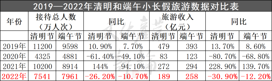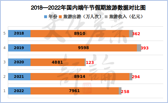 据文化和旅游部数据中心5日披露,2022年端午节假期,全国国内旅游出游7961.0万人次,同比下降10.7%,按可比口径恢复至2019年同期的86.8%;实现国内旅游收入258.2亿元人民币,同比下降12.2%,恢复至2019年同期的65.6%。** **