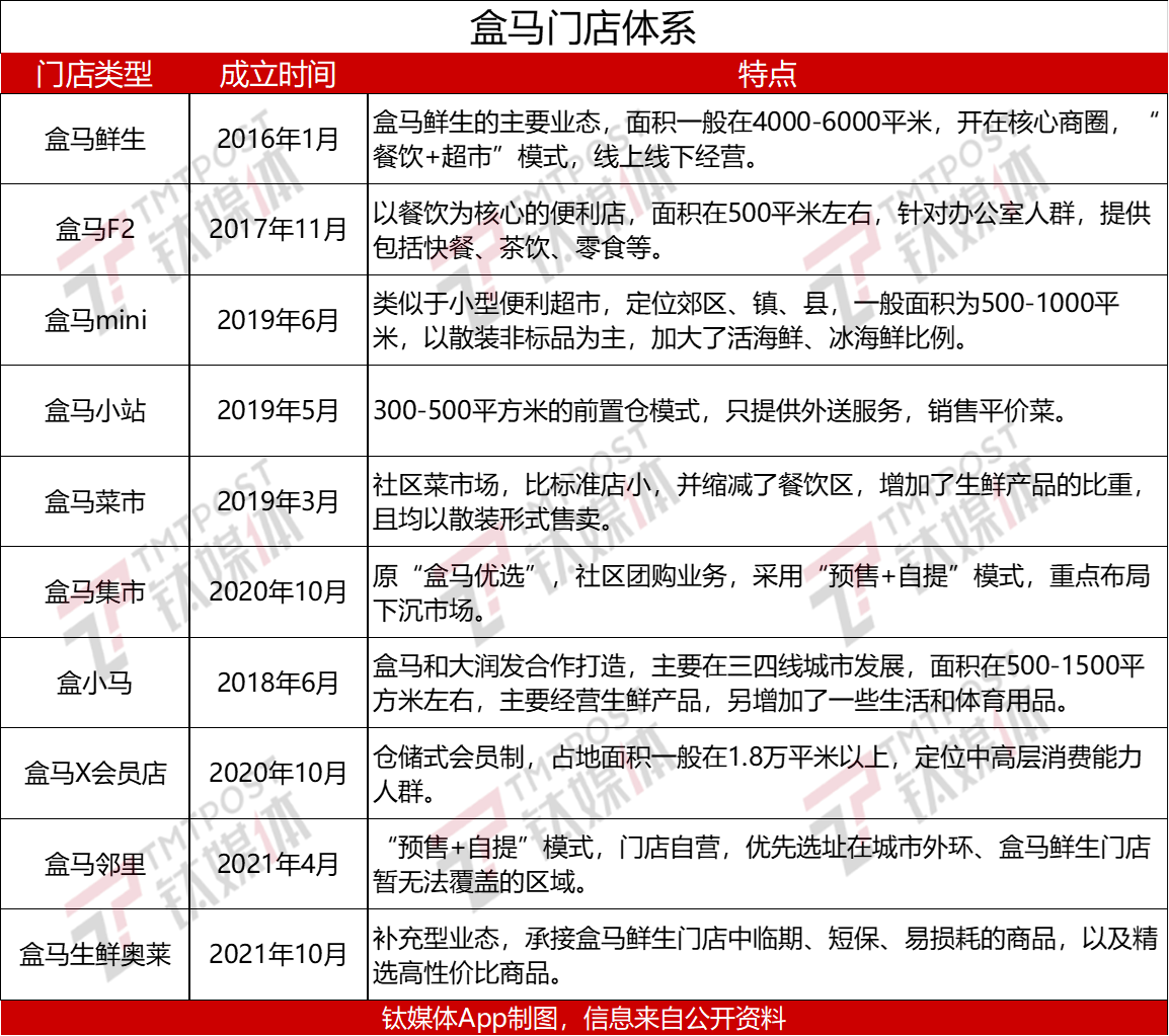 于是,在盒马鲜生大店的基础上,基于不同的人群、场景和需求,盒马方面陆续推出了包括盒马F2、盒小马、盒马菜市、盒马mini、盒马X会员店等近10种业态。