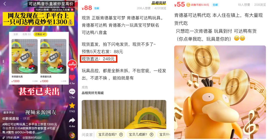 被可达鸭刷屏的人们怎会满足于远观,全国各地肯德基门店的可达鸭这些天皆被“一扫而空”,可怜的店员们一天不知道要说多少句“这没有鸭子了”。而在众多二手商品交易平台上,「可达鸭音乐盒」不出意外地被黄牛炒出500+、1000+的夸张高价,甚至催生出略显荒诞的“代吃服务”(你给钱,玩具你拿,肯德基我吃)。