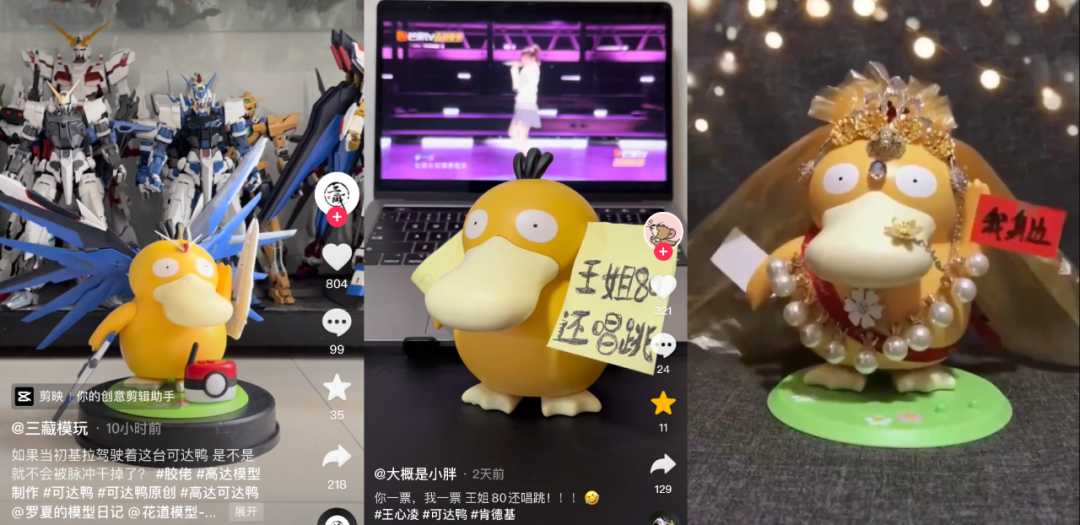 更绝的是,把流量密码玩明白了的达人,带着可达鸭蹭起王心凌的热度。左手一个“如果你突然打了个喷嚏”,右手一个“那一定就是我在想你”,左手一个“你一票我一票”,右手一个“心凌八十还能跳”,再搭配上心凌《爱你》的原声BGM,当下还有比这更硬核的应援打call短视频吗?
