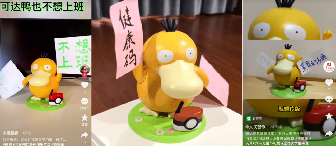 因打开电源这只可达鸭玩具可伴随音乐魔性舞蹈,随之间隔摆动的左右手可粘上任何“发言版”,于是该玩具被脑洞网友开发出千奇百怪的玩法,打工鸭、高达鸭、王心凌《爱你》版可达鸭、《西游记》天竺少女版可达鸭等版本层出不穷,在微博、抖音、B站上造就了一番“群鸭共舞”的二创盛世。