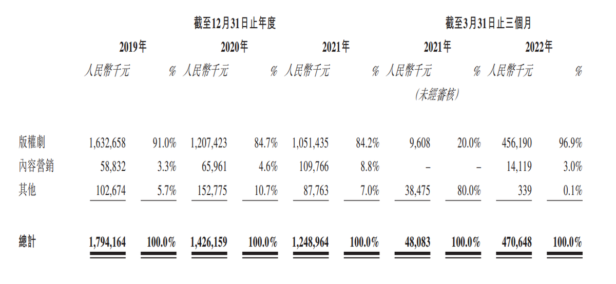 据招股书数据,截至2019年至2021年,柠萌影视自网络视频平台版权剧播映权授权产生的收入分别为人民币1,257.4百万元、896.8百万元、人民币722.5百万元,收入逐渐降低主要来自于版权费的下降。