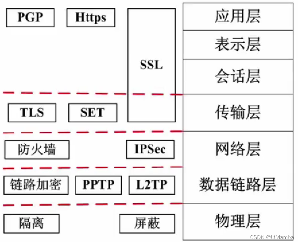 物理层主要是物理手段,其它层靠协议来保证传输安全。图示