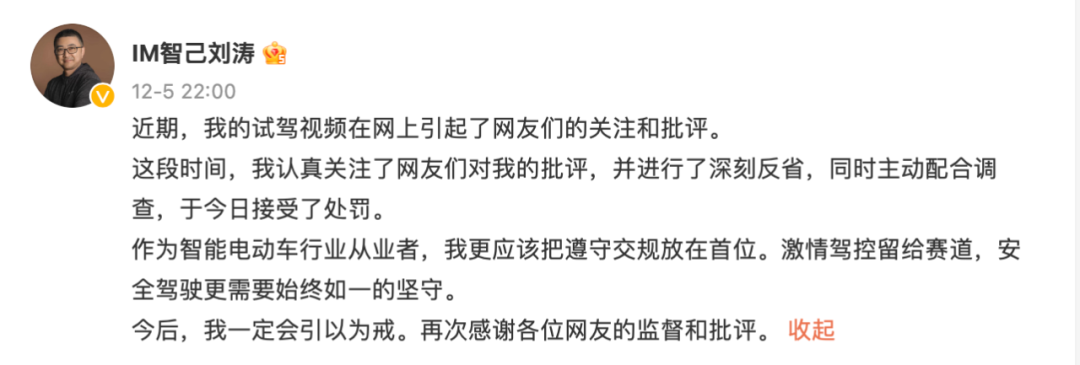 12月5日,智己汽车联席CEO刘涛发表了一条微博,对此前他被指“在高架环路试驾智己L7涉嫌违反交通法规”一事致歉。