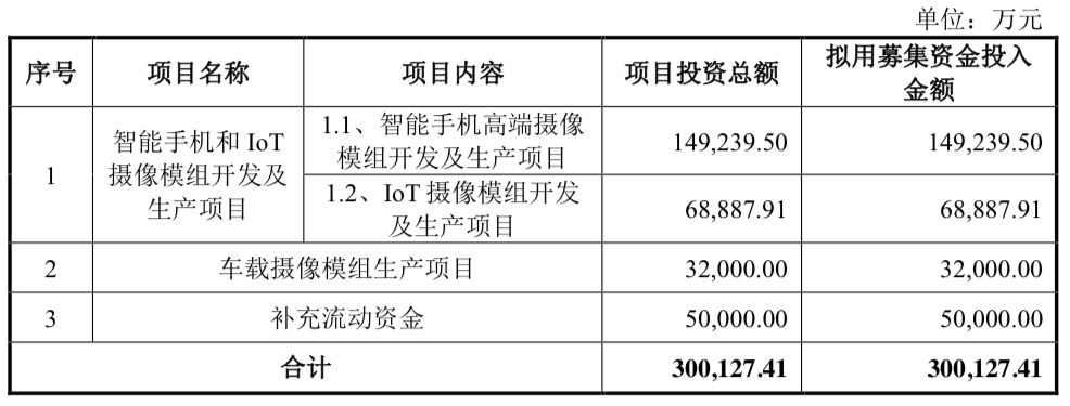 除了补充流动资金,本次创业板IPO丘钛微30.01亿募资中剩余的25.01亿元将用于项目建设。其中14.92亿元用于智能手机高端摄像模组开发及生产项目,6.89亿元用于IoT摄像模组开发及生产项目,3.2亿元用于车载摄像模组生产项目。