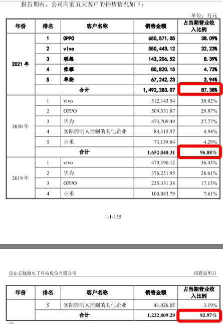 钛媒体APP注意到,智能手机市场高度集中不仅蚕食丘钛微的利润空间,还是其客户高度集中的重要原因。报告期内,前五大客户销售金额占当其营收比例分别为92.97%、96.88%、87.38%。
