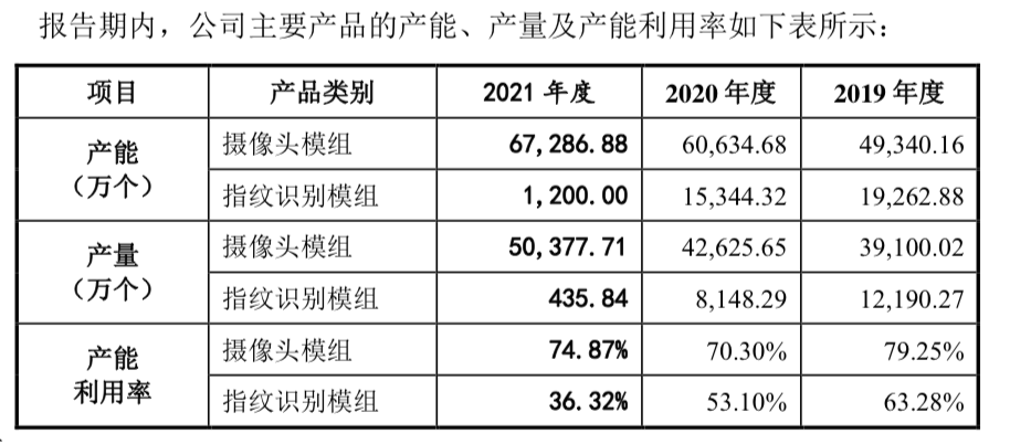 钛媒体App注意到,募投项目涉及的摄像头模组项目,尚有不少闲置产能。招股书显示,2019年-2021年,丘钛微的摄像头模组产能分别是4.93亿个、6.06亿个、6.73亿个,实际产能利用率分别为79.25%、70.30%和 74.87%,超两成产能闲置。
