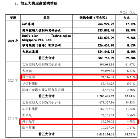 产业布局上的劣势,让丘钛微受到上下游夹击,处于腹背受敌的被动局面。与之形成对比的是,同行业的舜宇光学向上游原材料深入,并已成功拓展至光学镜头。也因此,舜宇光学除了是丘钛微的竞争对手,还是其依赖的重要供应商。数据显示,2019年、2020年舜宇光学赫然进入丘钛微前五大供应商之列。