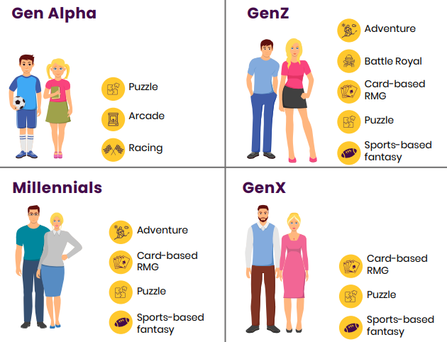 大逃杀和冒险游戏等以策略和动作元素为主的游戏最受欢迎,分别有55%和51%的游戏用户年龄处于13-27岁之间。大约50%的Z世代游戏用户(年龄在18~27岁之间)也热衷于真金游戏。另外,千禧一代更愿意将游戏时间花在冒险、益智解谜、街机和竞速跑酷游戏上,这个年龄段的用户中有近35%热爱基于技能的真金游戏。而对于X世代的用户来说,卡牌真金游戏、益智解谜以及梦幻体育是他们的最爱。