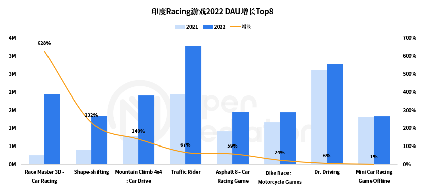 值得一提的是,竞速(Racing)游戏也是印度用户增长Top1品类,2022年,印度竞速游戏中《Race Master 3D》(2022DAU +625%)、《Shape-shifting》(2022DAU +232%)、《Mountain Climb 4x4 : Car Drive》(2022DAU +140%)、《Traffic Rider》(2022DAU +67%)、《Asphalt 8 - Car Racing Game》(2022DAU +59%)、《Bike Race:Motorcycle Games》(2022DAU +24%)实现了DAU的最快增长。
