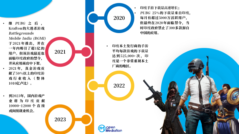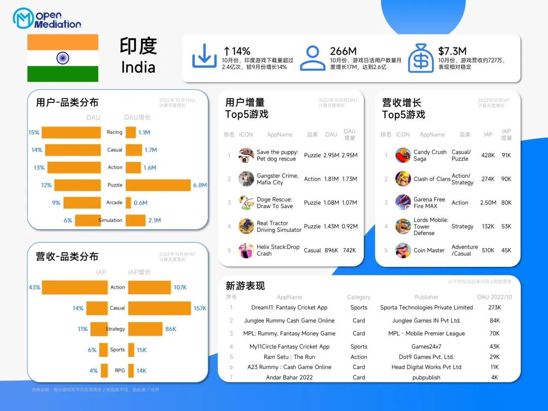 2022年,仅印度手游市场就产生了22亿美元的收入,并拥有3.73亿玩家,其中91%是手游用户,毋庸置疑,印度是全球第二大游戏市场。但这一市场却由于“本土化要求高”、“成本回收较难”、“信息差异较大”等原因一度成为中国出海最难进入的市场之一。印度市场到底如何?为探寻这个问题,OM出海研究所整理了关于2022年印度市场最新的数据和结论,并通过本文展示出来,****以下为印度2022游戏市场全景中的重点内容: