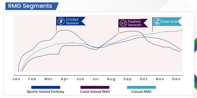其三,2021年,真金游戏贡献了50%以上的印度游戏行业收入(整体1010亿卢比),这类游戏在2022年的3月、8月、11月分别因为板球赛事、节日、年终运营活动迎来高峰增长——板球赛事期间,梦幻体育游戏达到年度高峰;节日期间,卡牌真金游戏达到高峰;到了年底,则是休闲玩法的真金游戏高速增长。