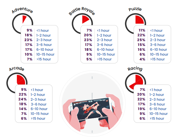 在印度游戏五大热门品类中,过去六个月,51%的用户在冒险、竞速游戏中停留时间超过3小时,这个数据在大逃杀中是49%,也接近一半,说明这三个品类在印度的用户粘性最高。
