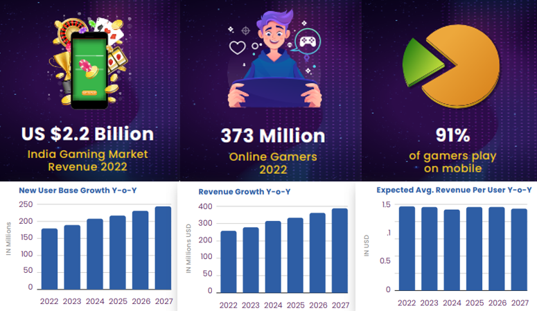 其一,2022年印度全年游戏市场营收22亿美金,预计到2024年突破30亿美金,五年左右突破40亿。