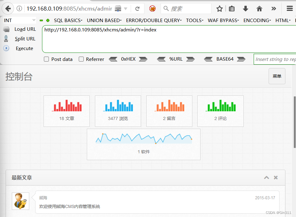 进行更改,localhost/xhcms/admin/?r=index,显然cookie没有通过访问不了,这时用burpsuite进行抓包,更改Cookie为“user=1”